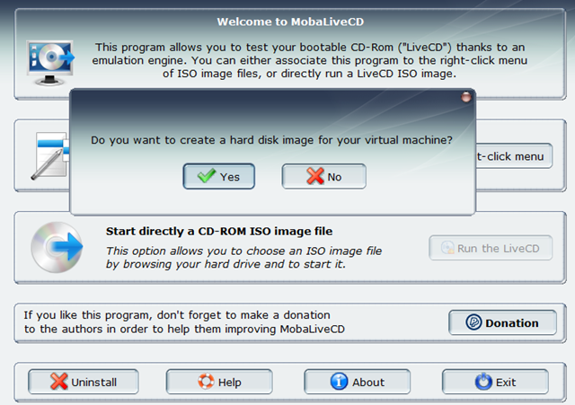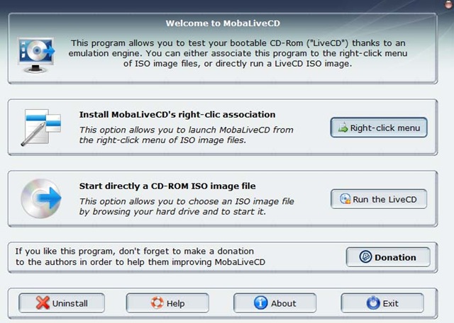 The best reason for using MobaLiveCD is that it can allows you to test your LiveCD with just a single click without the need to burn a CD-Rom or to reboot your computer i.e after downloading the ISO image file of your favourite LiveCD, you just have to start it in MobaLiveCD.