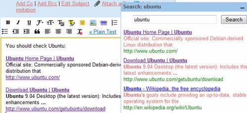 Google’s Gmail Labs brings another one splendid features, without opening a new tab in your browser you can search for a query directly inside your Gmail and as well in your messages area you can directly copy and paste or alternatively drag&drop links to messages area. Whenever you need to share any information, you might don’t know the critical url or have approximate idea, you can try this options to get accurate links from Google engine.