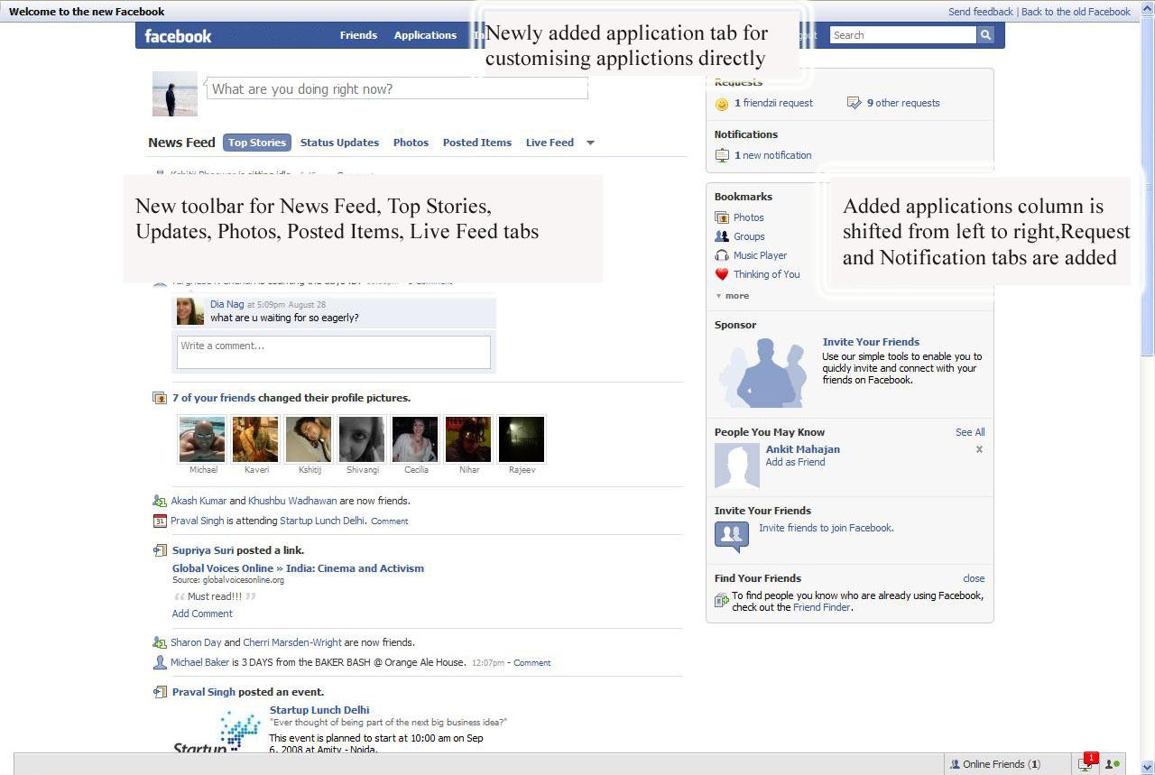 Some important changes that have been made in Facebook’s Home Page is the addition of a new toolbar which has different tabs for the functionalities of Mini Feed , Top Stories , Status Updates , Photos and posted items from all other users as well. The whole column which previously comprised the added application is shifted from left panel to the right. The “Request and Notification column” are also added. There are also some minute changes like search box placed in the header, a box placed just below the header for allowing the users to update their current status. The status update column has been removed.