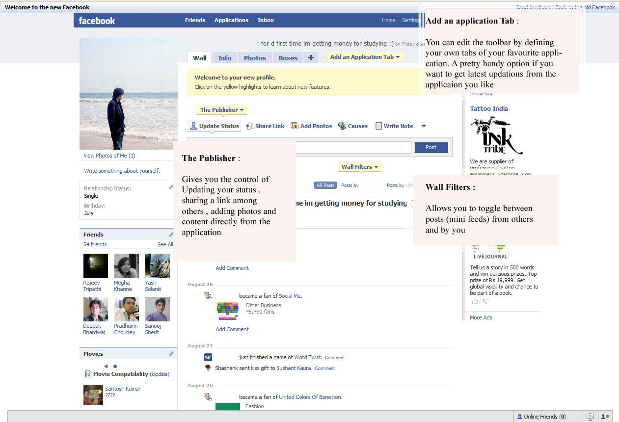 These changes have been made in order to make Facebook more user friendly by allowing the users to change settings of almost everything! There are new ways of user-to-user communication in which they can share their content with their peers: application tabs enable users to share unique content from their favorite deep applications, and profile boxes enable users to express themselves in smaller forms than tabs. Application info sections enable users to share structured content from applications on the Info tab. The wall attachment is significantly upgraded by Publisher integration which enables users to easily post content of any type on their as well as their friends’ profiles.