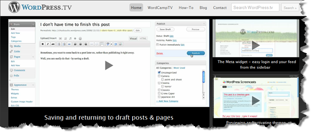 WordPress.tv provides how to tutorials for blogging on wordpress in a simple way it helps in tapering the way of your blogging.It also furnishes WordCamp events happening all over the words. In a bare words its an awesome platform to engage the wordPress community.